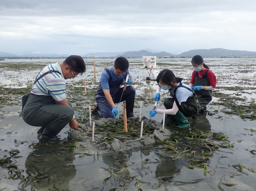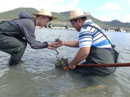 团队的导师们亲自带领研究生开展科学研究,贯通第一第二育人课堂,培养具有学术洞察力的研究生。在学术研究中坚持理论学习与社会实践相结合,大兴调查研究之风,引导研究生深入海草床现场进行实践调研。史云峰教授多次带领研究生调研海草生长情况,理论联系实际,结合国家及地方需求,开展实践,提升了学生实际场地调研能力与科研能力。